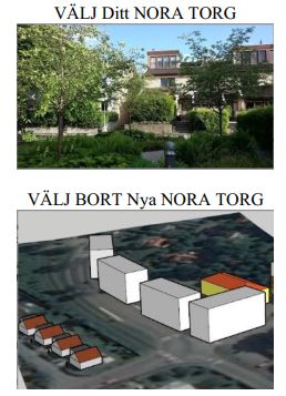 Vi kräver att kommunen avbryter den pågående planeringen av höga hus mitt bland villorna runt Nora torg. Planeringen måste starta om och då i samarbete med oss som bor i området.