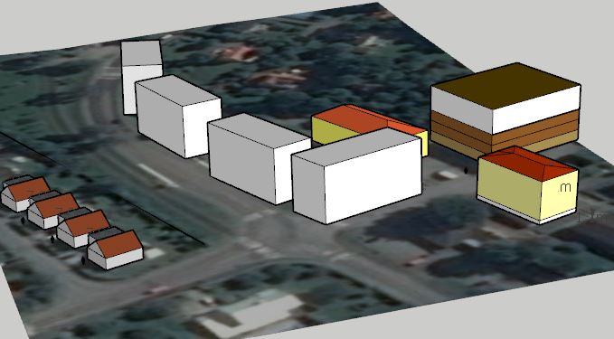 Kommunens förslag innebär att fyra 15 meter höga hus med fyra våningar byggs vid Noragårdsvägen och infarten till Nora torg. Dessutom tillkommer extra våningar på Danarö 6 (det gula huset i förgrunden) och Köpmannen 1 (huset med brunt tak).