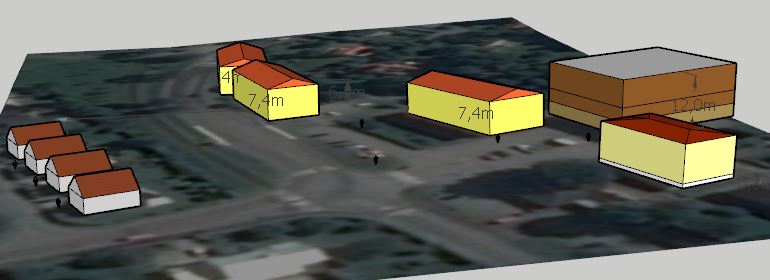 De fyra nya husen är tänkta att bli så stora att de inte ryms söder om Noragårdsvägen. Därför föreslår kommunen att vägen ska flyttas norrut och kommer mycket nära husen på Näckrosvägen (kedjehusen till vänster). Det gör att dessa hus skuggas okt-mars. Under de nya stora husen tänker man spränga ned ett garage, som dock blir så litet att många inte kommer att få plats.