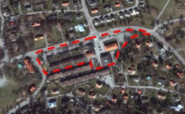 Denna bild visar planområdets omfattning inkl garage och parkeringsplatser som fastighetsägarna har rättigheter till genom servitut. Det är ytterst märkligt att kommunen inte tog reda på detta. Även bostadsrättsföreningen Hornets hus (med orange tak) inkluderas i området trots att det inte är tillgängligt för planering.